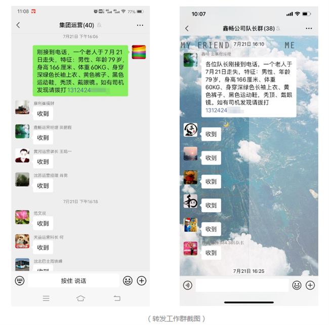 7月21日,沈陽客運(yùn)集團(tuán)運(yùn)營部接到市民求助電話,請求幫忙尋找一名走失的老人。運(yùn)營部立即將求助信息發(fā)送至各運(yùn)營單位,由各運(yùn)營單位轉(zhuǎn)發(fā)至各線路隊(duì)長,再由各隊(duì)長轉(zhuǎn)發(fā)至各車隊(duì)微信工作群。