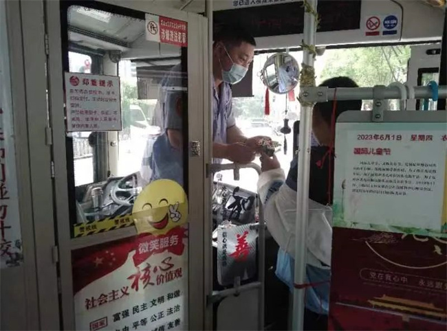 6月1日一大早,繆立眾駕駛著這輛滿載著小禮物和卡通元素的公交車準時發(fā)車。一名女乘客帶著小朋友剛一上車,繆立眾的小禮物便送到了小朋友面前。