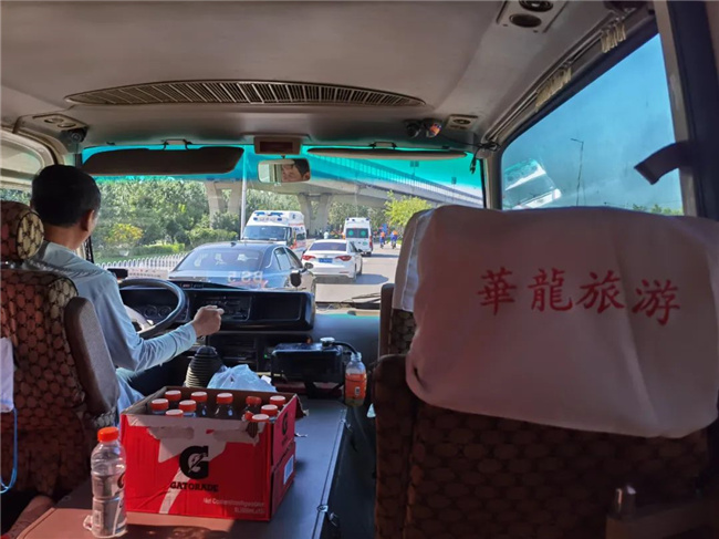 比賽開始后,為保障參賽選手的安全,華龍公司5臺中巴車輛又化身“賽道收容車”,緊跟在組委會領(lǐng)頭車輛身后,沿著參賽選手的比賽路線,一路伴隨著參賽選手行駛,為比賽途中發(fā)生意外及體力不支的運動員提供幫助。