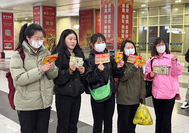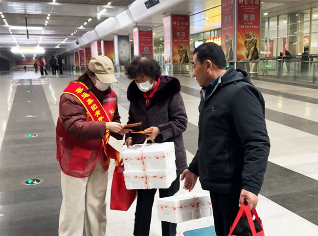 活動中,團員青年及志愿者在沈陽南站出站口、地鐵口及公交樞紐站服務臺向廣大乘客發(fā)放“沈陽最美網(wǎng)紅打卡地圖”DM傳單及暖寶寶。