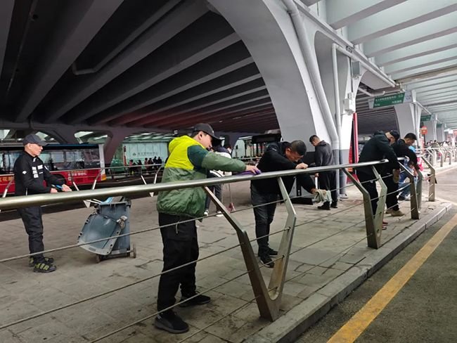 場站公司開展“清潔公交站臺,擦亮文明城市窗口”志愿服務(wù)活動。志愿者們帶著抹布、水桶、掃帚等清潔工具,在北站公交樞紐站對電子站牌、排隊護欄、座椅等進行清潔整理,改善了乘客的候車環(huán)境。