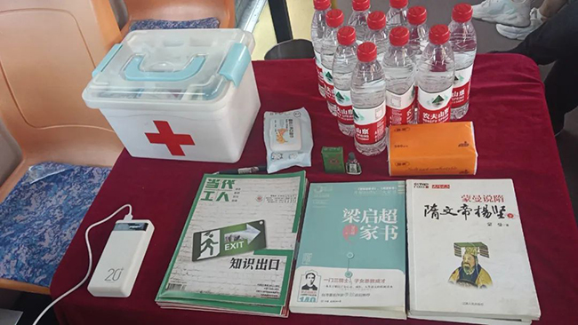 車(chē)身懸掛著“以夢(mèng)為馬,不負(fù)韶華,中考砥礪前行”“九年寒窗,在此一搏,沖刺中考,奮斗今朝”等祝福條幅,車(chē)廂內(nèi),飲用水、充電寶、文具、應(yīng)急藥物、雨傘、紙巾以及書(shū)籍應(yīng)有盡有。不一會(huì)兒,車(chē)內(nèi)就坐了不少家長(zhǎng),對(duì)此,家長(zhǎng)們很是感動(dòng),感謝車(chē)隊(duì)和王師傅提供的休息場(chǎng)所。