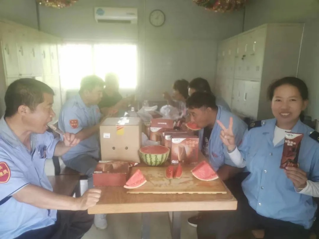 在210.227.280路車隊(duì)站務(wù)室,處于運(yùn)營(yíng)間歇的駕駛員們正圍坐在一起,有的在大口吃著西瓜,有的在細(xì)品雪糕的香甜和涼爽,大家有說有笑,一解暑氣。一旁的駕駛員楊麗麗為大家服務(wù)著,切西瓜、遞雪糕,其樂融融。