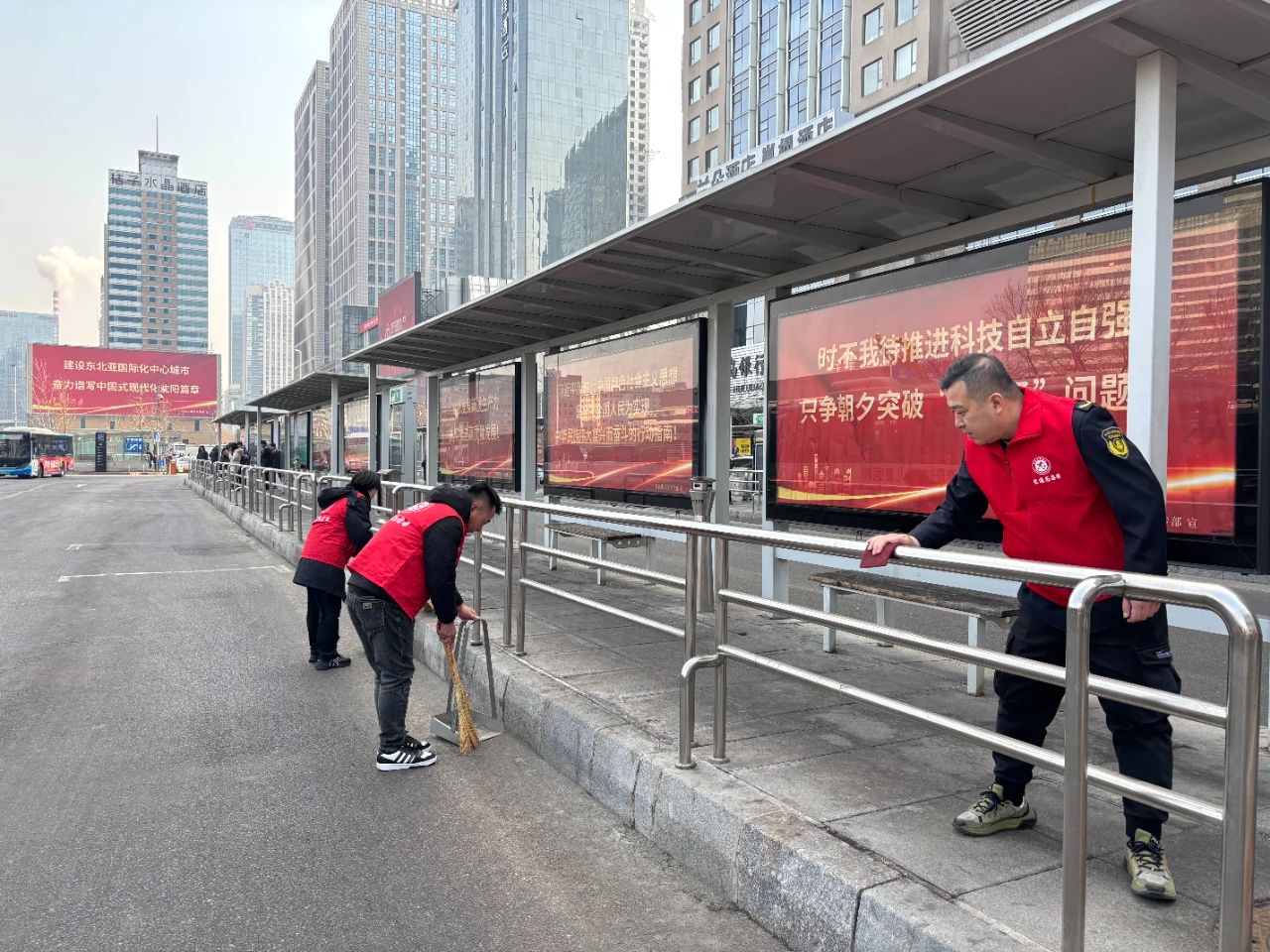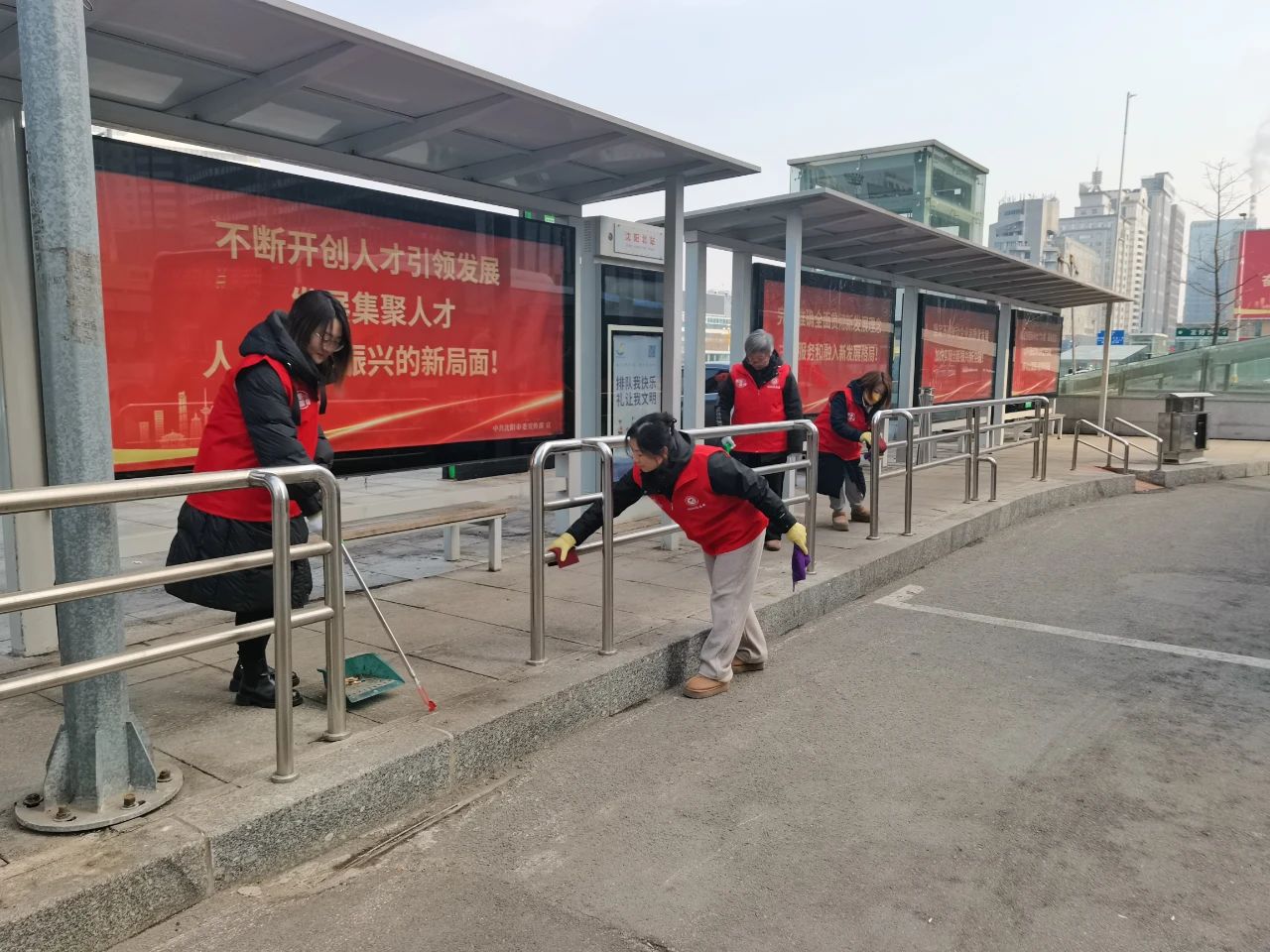 在北站公交樞紐站,志愿者們認(rèn)真清掃公交樞紐站內(nèi)的垃圾、擦拭公交候車?yán)纫约芭抨?duì)護(hù)欄,不放過任何一個(gè)衛(wèi)生死角,為乘客們營造了一個(gè)整潔舒適的候車環(huán)境。