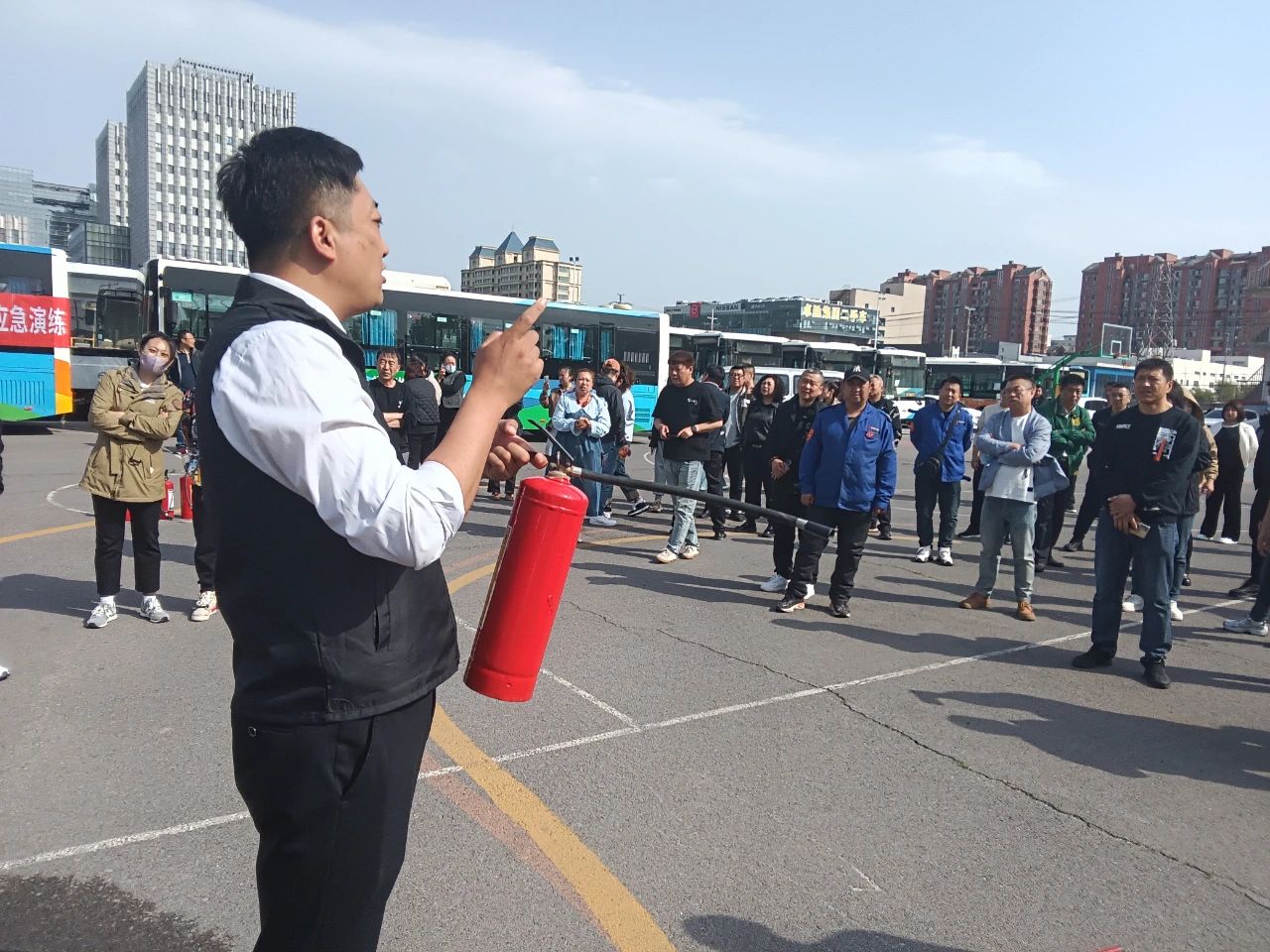 室外環(huán)節(jié),車隊(duì)管理人員和駕駛員現(xiàn)場學(xué)習(xí)了在公交車輛突發(fā)事件中,駕駛員如何采取應(yīng)急措施,疏散乘客到安全位置,以及如何正確使用滅火器進(jìn)行滅火,最大限度保障人民生命財產(chǎn)安全。