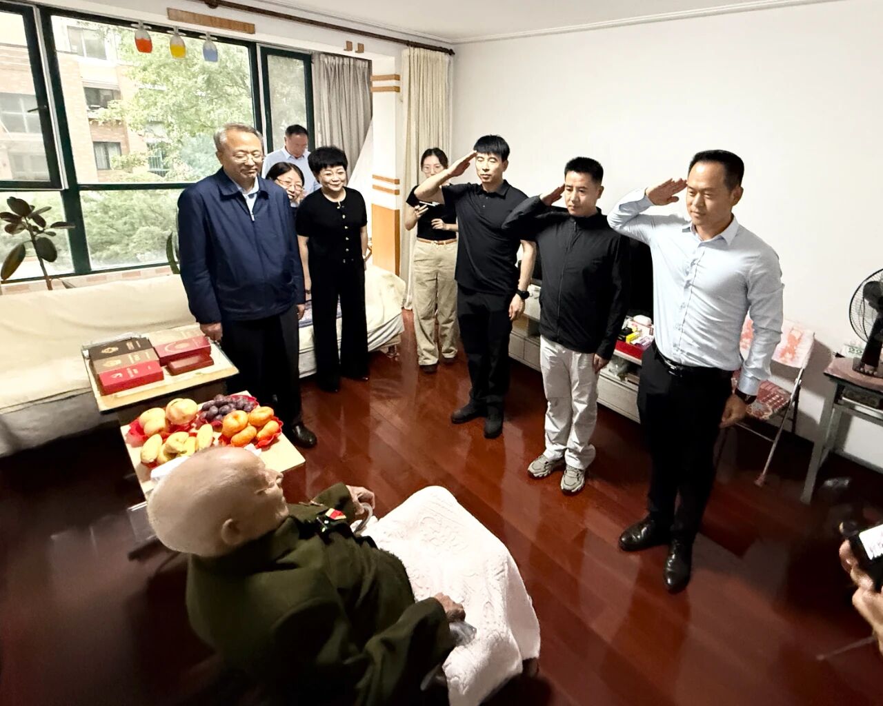 慰問過程中,韓宗森老同志與家人深情回顧了當(dāng)年的革命歷程,特別是抗戰(zhàn)時(shí)期的崢嶸歲月和英勇事跡?,F(xiàn)場(chǎng)氣氛熱烈,韓老還和大家一起高唱《中國(guó)人民志愿軍戰(zhàn)歌》。雖已年過九旬,他依然思維敏捷、聲音洪亮、精神矍鑠。在場(chǎng)的工作人員和退役軍人無不為之動(dòng)容,自發(fā)地向韓老行莊嚴(yán)的軍禮,表達(dá)由衷的敬意。