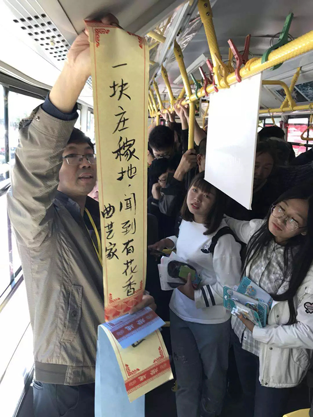 9月22日上午九點,藝術(shù)家們來到130路渾南終點站,在民間文藝號和美術(shù)號公交車上為乘客準(zhǔn)備了民俗與文藝活動。燈謎活動由和平區(qū)民協(xié)燈謎學(xué)會主席蘇穎親自上陣主持。謎面剛一亮出,就受到了乘客的歡迎,車廂前后的乘客都把注意力集中過來。燈謎作品不但涉及中秋、國慶以及社會主義核心價值觀、中國夢等主題,還兼有各類百科謎作。比如:“中秋大派送(三字?jǐn)?shù)量詞)一一十五發(fā)”、“中國夢初現(xiàn)(廣西地名)一一玉林”、“書里寫得很清楚(社會主義核心價值觀詞語)一一文明”等;和交通相關(guān)的如:“雙雙上車來(字)一一輟”;近期熱點的如:“一塊莊稼地,聞到有花香(曲藝家)一一單田芳”等等。雖然謎作難易有異,但經(jīng)過啟發(fā),均能被乘客猜出,個別謎還能夠出現(xiàn)被秒殺的狀況。好多謎在被猜中后,都傳來乘客會心的笑聲,月餅等獎品也受到大家的喜愛,弘揚燈謎文化的同時也讓乘客們增長了百科知識。