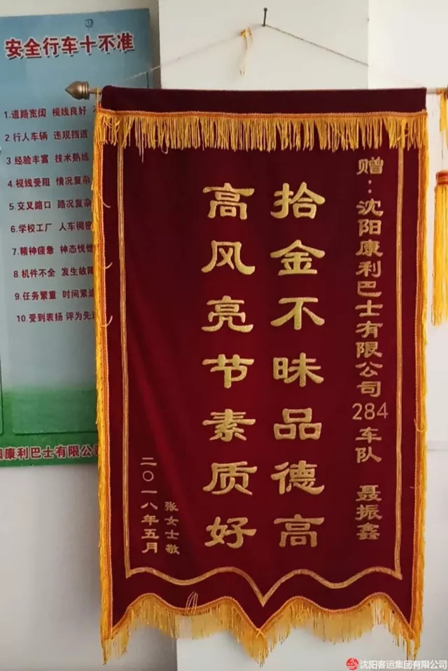 近日,康利公司284路車隊接連收到兩面錦旗。5月8日,284路駕駛員劉曉峰在車輛抵達終點站時,發(fā)現(xiàn)路邊有一部手機,好心的劉曉峰連忙撿起手機,因為還要行車,便將手機上交車隊,請車隊工作人員幫忙尋找失主。工作人員通過各方努力,最終找到了失主薛先生。“手機雖不是很貴重,但里面有我很重要的資料和照片,本來我都不抱希望了,沒想到這種拾金不昧的好人好事也能發(fā)生在我的身上!”失主薛先生激動地說,為表達自己的感激之情,薛先生親手把一面錦旗送到了劉曉峰手中。